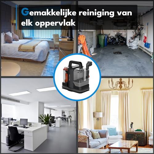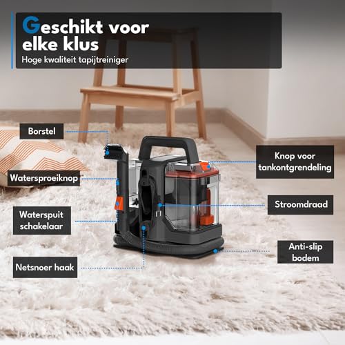 Handzaam en licht van gewicht Inclusief twee opzetstukken Reinigingsborstel met ingebouwde sproeier voor optimale resultaten Uitneembare watertanks voor gemakkelijk bijvullen en legen Krachtige 400W-motor, sterker dan de concurrentie Zeer sterke zuigkracht van 9000 Pa voor het effectief verwijderen van zelfs de meest hardnekkige vlekken. 2 Watertanks Flexibel